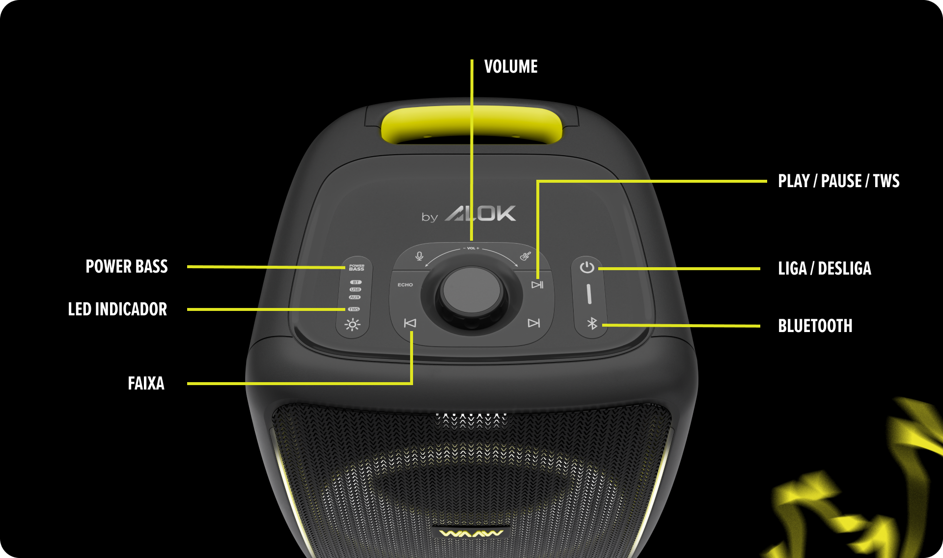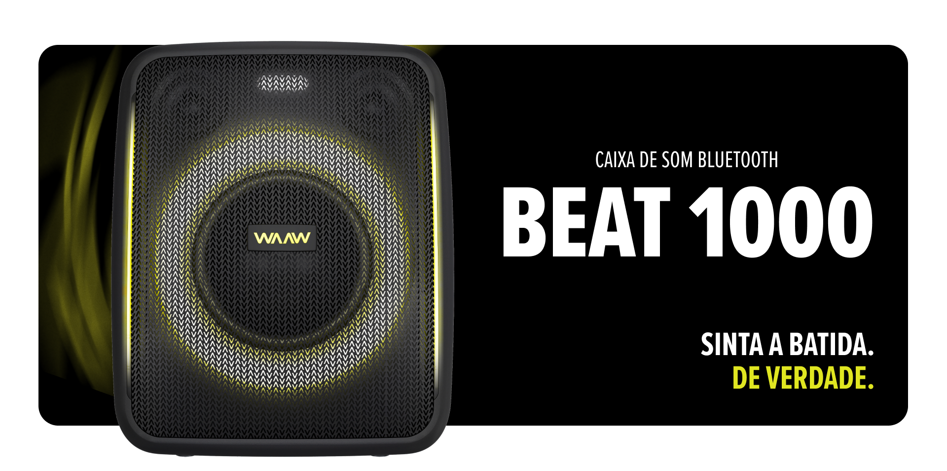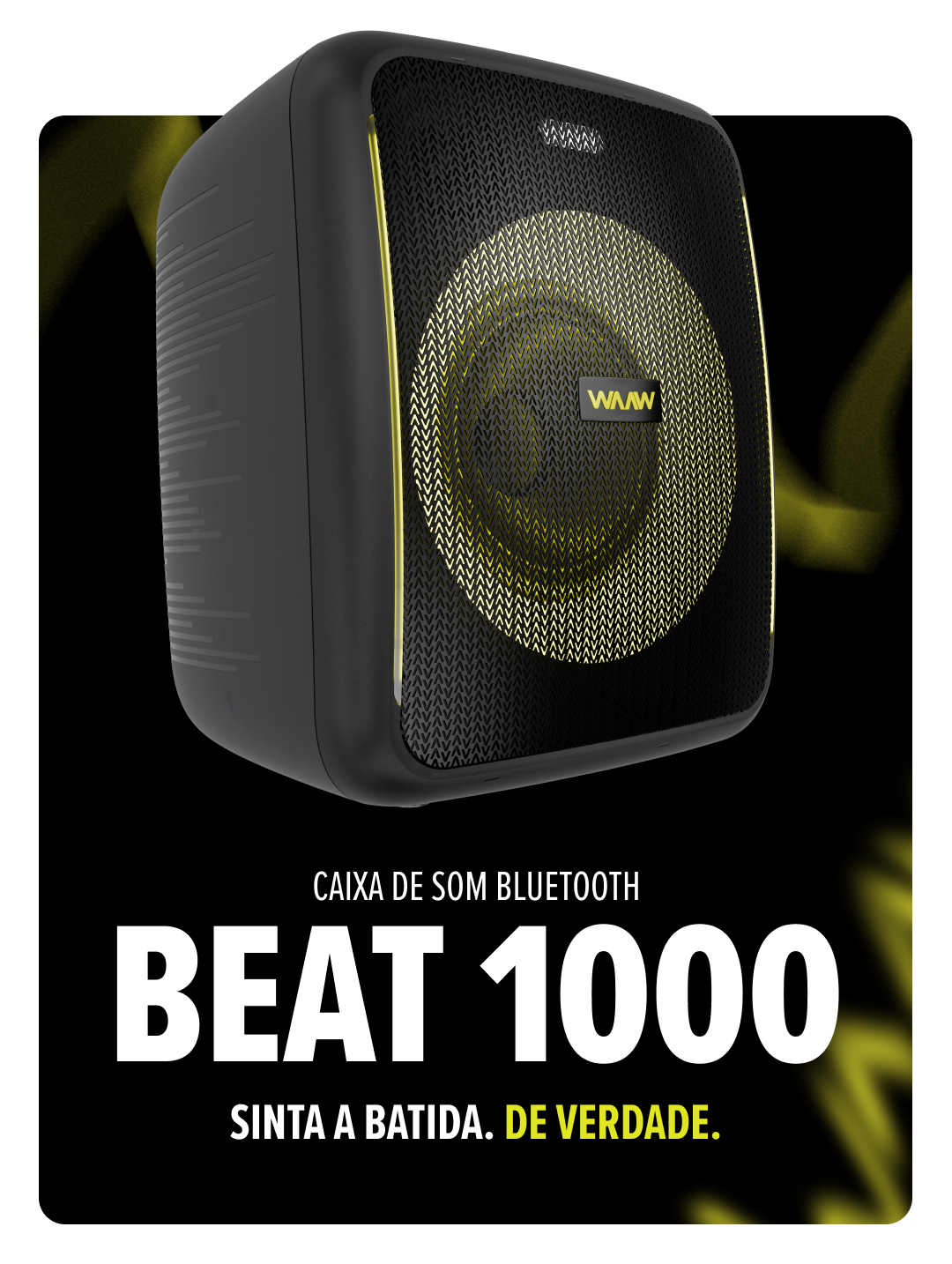Visual moderno, som potente e alça WAAW TO GO para levar a vibe com você. A BEAT 1000 transforma qualquer lugar em pista de dança. É só pegar, conectar e deixar o som comandar o clima.