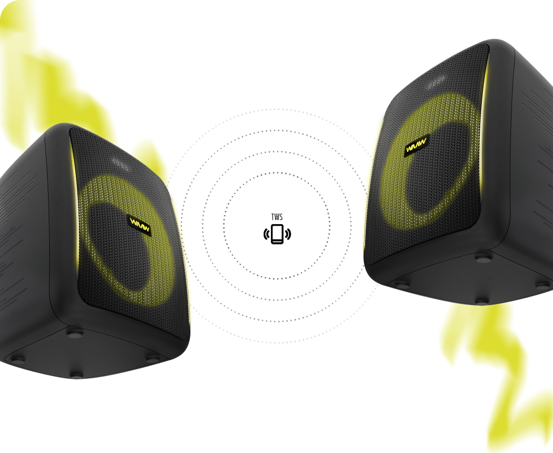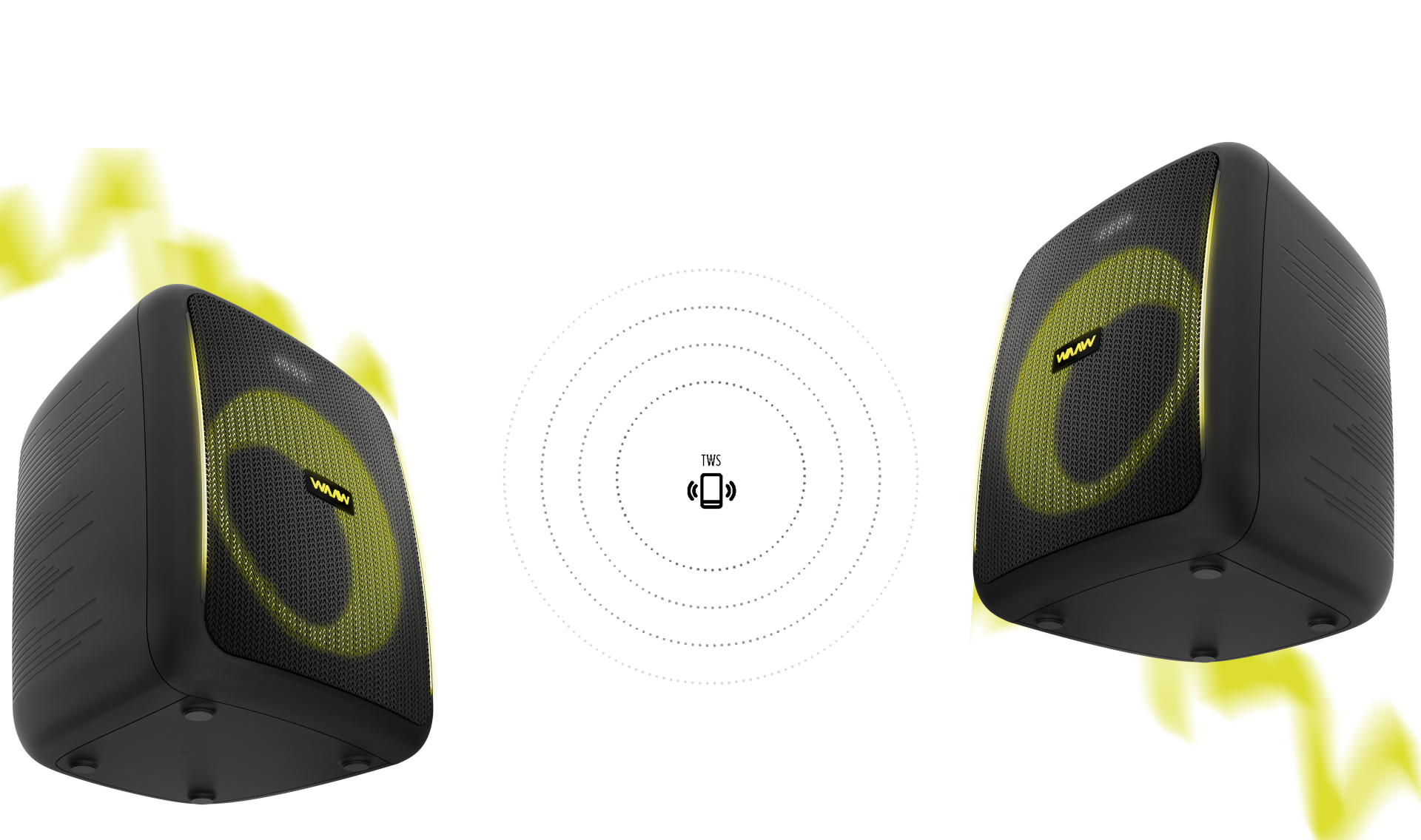 Para quando o volume máximo não basta, você pode usar o WAAW PLUS, com a tecnologia TWS, que permite parear duas caixas Beat 1000 no mesmo dispositivo e criar um som estéreo mais imersivo e potente.