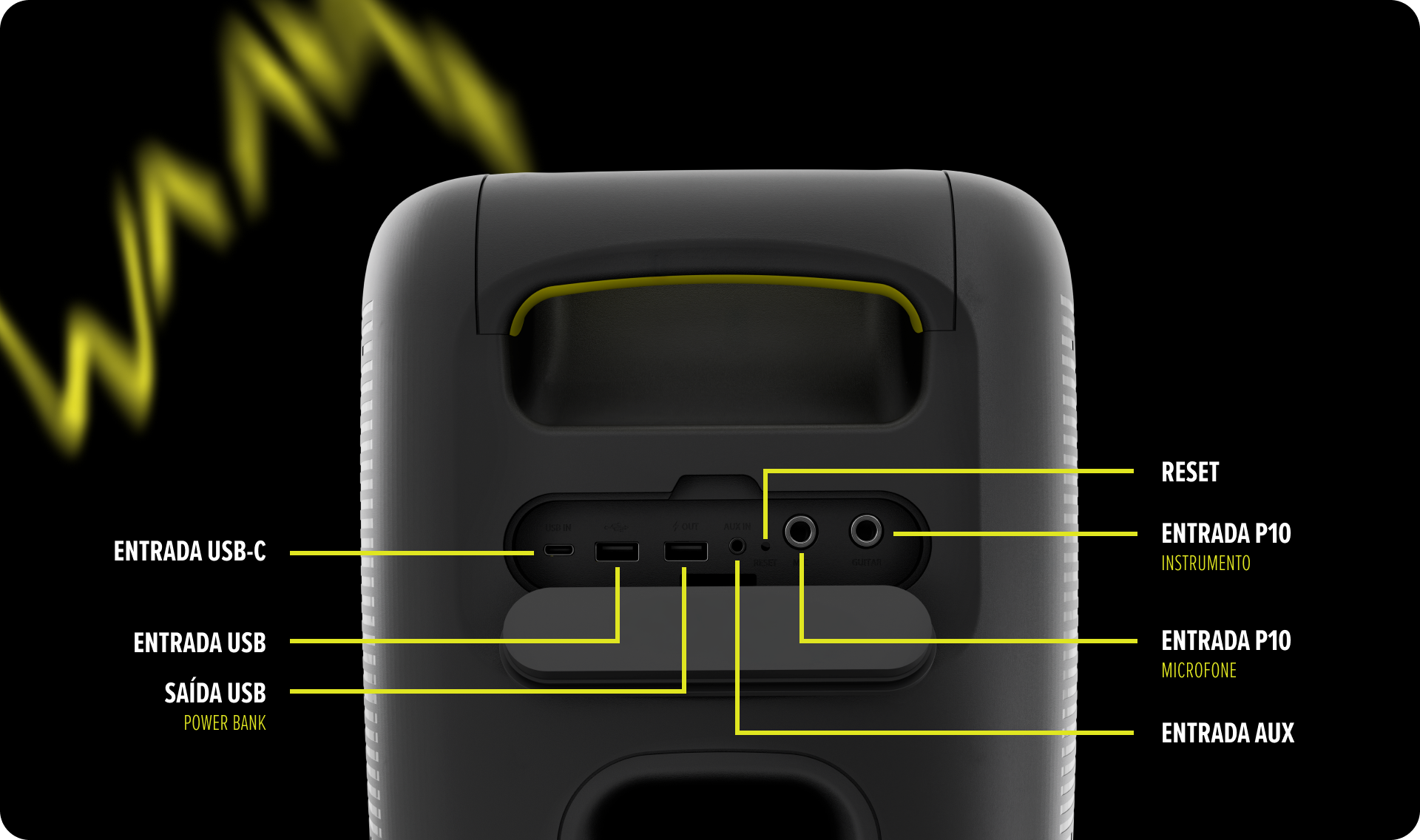 Sinta a potência dos graves nas suas músicas! Ao acionar o botão Power Bass da caixa de som, cada batida ganha vida, proporcionando uma experiência sonora envolvente, sem distorções