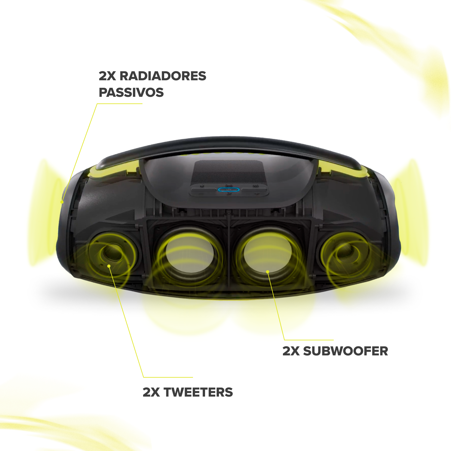 2x Tweeter, 2x Woofer, Painel com botões, Suporte para celular, Pegador metálico, Tampa com conexões, Conexões