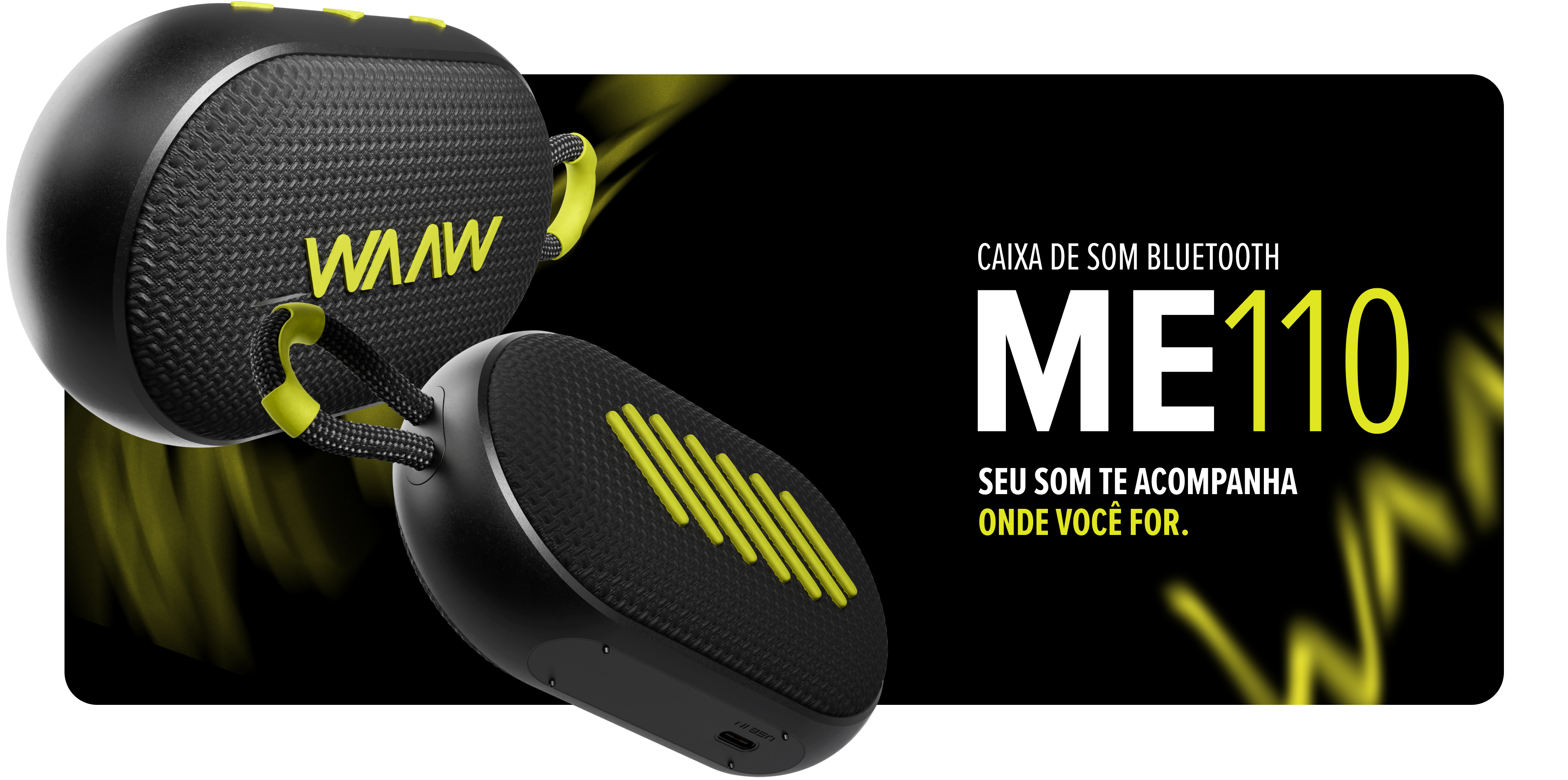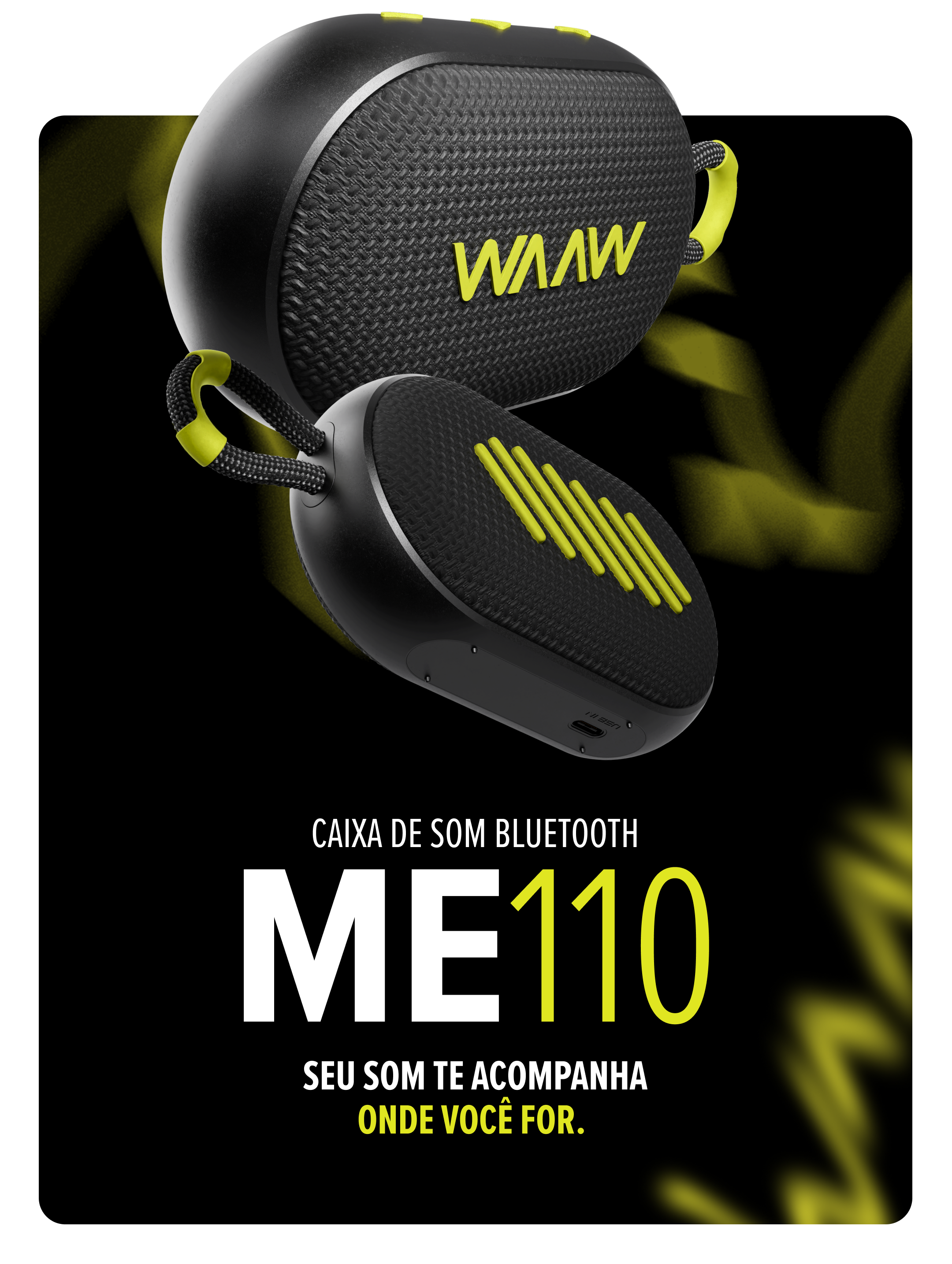 A trilha sonora dos seus rolês está garantida com os 6W RMS de potência da Speaker Bluetooth WAAW ME 110. Além de entregar graves profundos e um som envolvente, que faz você sentir cada batida, ela oferece aquela dose extra de intensidade para quando o volume máximo não é o suficiente.