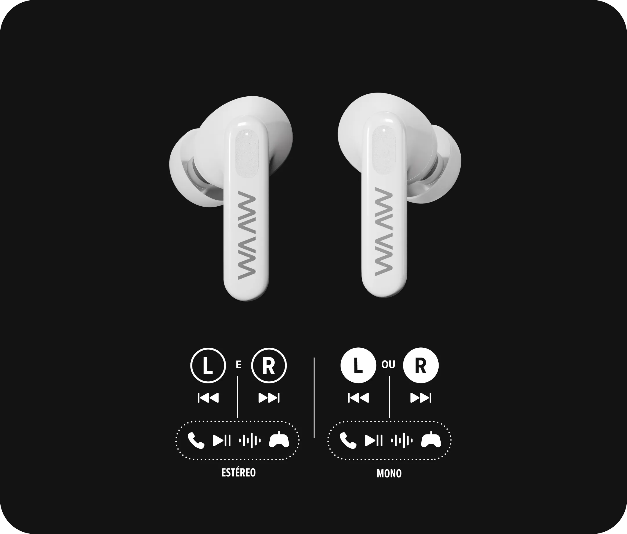 A vantagem que faltava para você assumir a liderança é o modo gamer do WAAW MOB 500 ANC. Com menor tempo de resposta para uma performance superior, o áudio é sincronizado com as ações do jogo, proporcionando imersão e precisão total. Para explorar todas as funções, a tecnologia WAAW PLUS (TWS) permite aproveitar sua playlist sem fios, de forma totalmente independente.