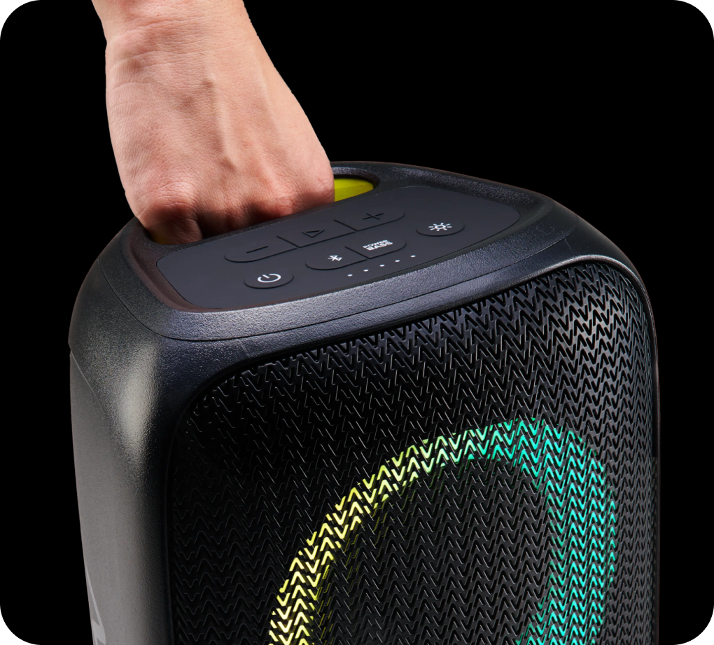 A Caixa de Som INFINITE 100 conta com um recurso poderoso que intensifica os graves, proporcionando batidas mais fortes e perceptíveis.