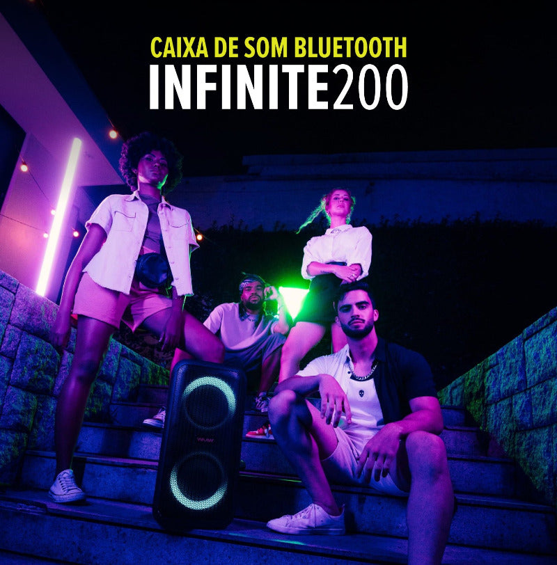 Classificação IPX7 resistente à água; Alça de transporte; Conecte até duas Hyperboom via Bluetooth; Waaw PLUS, Tecnologia Tws;Caixa de Som Bluetooth Infinite 1000